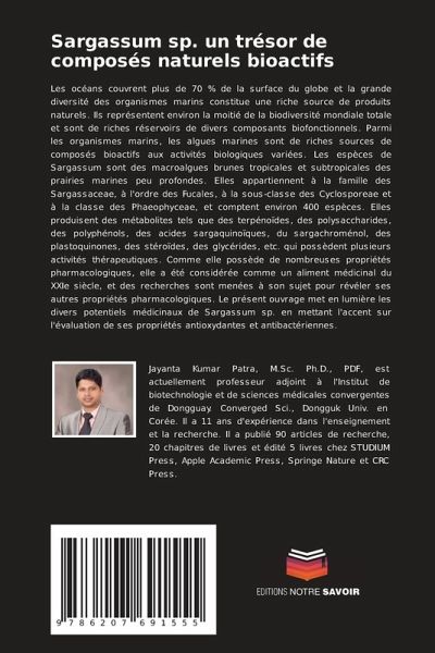 Les océans couvrent plus de 70 % de la surface du globe et la grande diversité des organismes marins constitue une riche source de produits naturels. Ils représentent environ la moitié de la biodiversité mondiale totale et sont de riches réservoirs de divers composants biofonctionnels. Parmi les organismes marins, les algues marines sont de riches sources de composés bioactifs aux activités biologiques variées. Les espèces de Sargassum sont des macroalgues brunes tropicales et subtropicales des prairies marines peu profondes. Elles appartiennent à la famille des Sargassaceae, à l'ordre des Fucales, à la sous-classe des Cyclosporeae et à la classe des Phaeophyceae, et comptent environ 400 espèces. Elles produisent des métabolites tels que des terpénoïdes, des polysaccharides, des polyphénols, des acides sargaquinoïques, du sargachroménol, des plastoquinones, des stéroïdes, des glycérides, etc. qui possèdent plusieurs activités thérapeutiques. Comme elle possède de nombreuses propriétés pharmacologiques, elle a été considérée comme un aliment médicinal du XXIe siècle, et des recherches sont menées à son sujet pour révéler ses autres propriétés pharmacologiques. Le présent ouvrage met en lumière les divers potentiels médicinaux de Sargassum sp. en mettant l'accent sur l'évaluation de ses propriétés antioxydantes et antibactériennes.