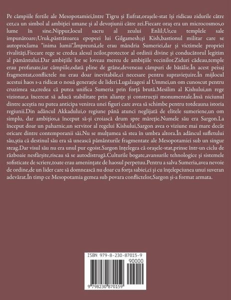 Pe câmpiile fertile ale Mesopotamiei,între Tigru ¿i Eufrat,oräele-stat î¿i ridicau zidurile c¿tre cer,ca un simbol al ambi¿iei umane ¿i al devo¿iunii c¿tre zei.Fiecare orä era un microcosmos,o lume în sine.Nippur,locul sacru al zeului Enlil;Ur,cu templele sale impun¿toare;Uruk,p¿str¿toarea epopeei lui Gilgamesh;¿i Kish,bastionul militar care se autoproclama "inima lumii".Împreun¿,ele erau mândria Sumeriei,dar ¿i victimele propriei rivalit¿¿i.Fiecare rege se credea alesul zeilor,protector al ordinii divine ¿i conduc¿torul legitim al p¿mântului.Dar ambi¿iile lor se loveau mereu de ambi¿iile vecinilor.Ziduri c¿deau,temple erau profanate,iar câmpiile,odat¿ pline de grâne,deveneau câmpuri de b¿t¿lie.În acest peisaj fragmentat,conflictele nu erau doar inevitabile,ci necesare pentru supravie¿uire.În mijlocul acestui haos s-a ridicat o nou¿ generäie de lideri.Lugalzagesi al Ummei,un om cunoscut pentru cruzimea sa,credea c¿ putea unifica Sumeria prin for¿¿ brut¿.Mesilim al Kishului,un rege vizionar,a încercat s¿ aduc¿ stabilitate prin alian¿e ¿i construc¿ii monumentale.Îns¿ niciunul dintre ace¿tia nu putea anticipa venirea unei figuri care avea s¿ schimbe pentru totdeauna istoria regiunii.Din adâncul Akkadului,o regiune pân¿ atunci neglijat¿ de elitele sumeriene,un om simplu, dar ambi¿ios,a început s¿-¿i croiasc¿ drum spre m¿re¿ie.Numele s¿u era Sargon.La început doar un paharnic,un servitor al regelui Kishului,Sargon avea o viziune mai mare decât oricare dintre contemporanii s¿i.Nu se mul¿umea s¿ stea în umbra altora.În adâncul sufletului s¿u,¿tia c¿ destinul s¿u era s¿ uneasc¿ p¿mânturile fragmentate ale Mesopotamiei sub un singur steag.Dar visul s¿u nu era unul pur egoist.Sargon în¿elegea c¿ oräele-stat,prinse într-un ciclu de r¿zboaie nesfâr¿ite,riscau s¿ se autodistrug¿.Culturile bogate,avansurile tehnologice ¿i sistemele sofisticate de scriere,toate erau amenin¿ate de haosul perpetuu.Pentru a salva Sumeria,avea nevoie de ordine,de un lider care s¿ domneasc¿ nu doar cu for¿a sabiei,ci ¿i cu în¿elepciunea unui suveran adev¿rat.În timp ce Mesopotamia gemea sub povara conflictelor,Sargon ¿i-a format armata.