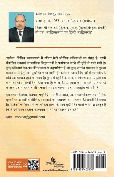 'Sarjana' is a collection of original poems composed by of Dr. Pathak in different time periods. The poems compiled in this book have been composed with a view to expose the social distortions. Some poems are inspired by the feeling of patriotism, some are vocal to provide protection from the terrorism, while some talk about women empowerment. In certain poetic genres, there is a sense of being faithful to the supreme power. In some, the expressions of love for nature have been expressed by the captivating depiction of nature. The inclusion of original works based on love of love, patriotism, love of nature, respect for women, empowerment of women and moral values ¿¿is the specialty of this compilation. The 'first edition' of 'Sarjana' is presented to the sage scholars with the hope that they will read it and taste its poetic expressions.