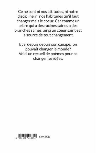 Ce ne sont ni nos attitudes, ni notre discipline, ni nos habitudes qu'il faut changer mais le coeur. Car comme un arbre qui a des racines saines a des branches saines, ainsi un coeur saint est la source de tout changement.Et si depuis depuis son canapé, on pouvait changer le monde?Voici un recueil de poèmes pour se changer les idées.