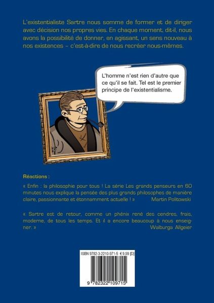 Le livre " Sartre en 60 minutes " explique l'essentiel de la pensée de Sartre en s'appuyant sur plus de cinquante citations. L'accent est mis sur la découverte du libre arbitre de l'homme et sur la structure des relations entre les hommes. Le chapitre " À quoi nous servent la découverte de Sartre aujourd'hui ? " démontre l'importance de sa pensée pour notre vie personnelle et notre société. Le livre est paru dans la collection à succès " Grands penseurs en 60 minutes ".