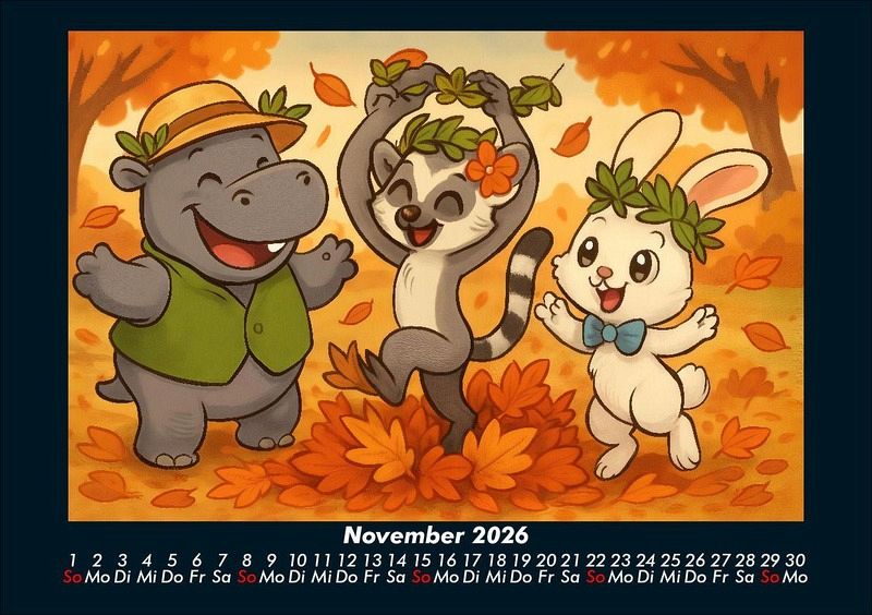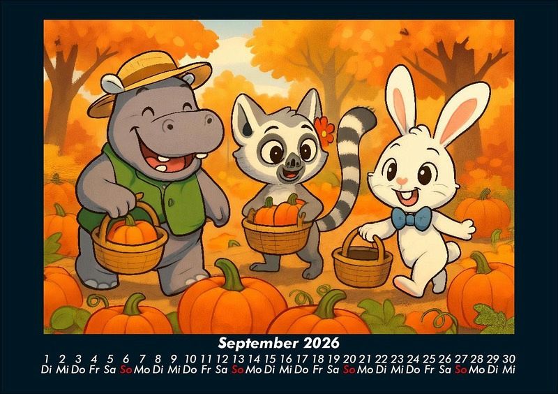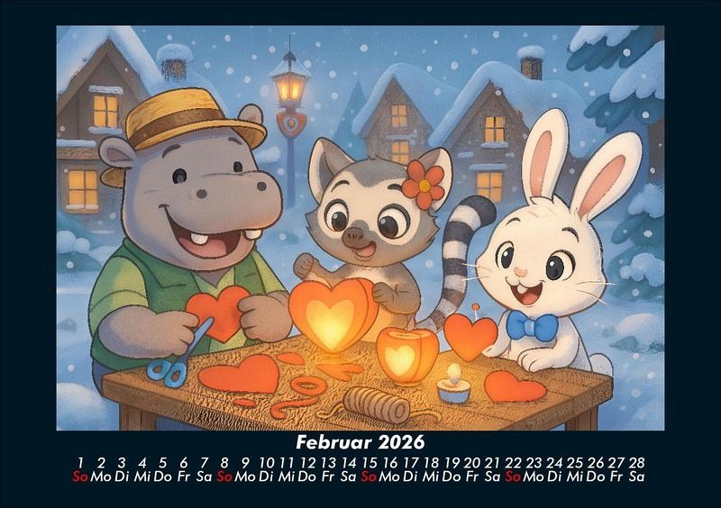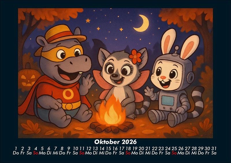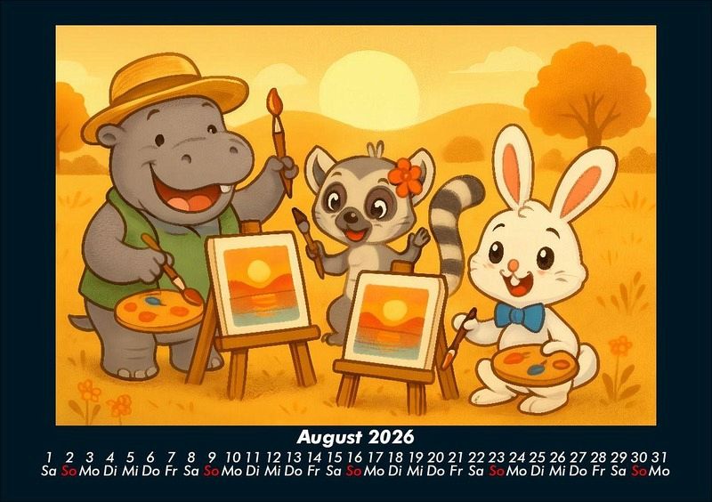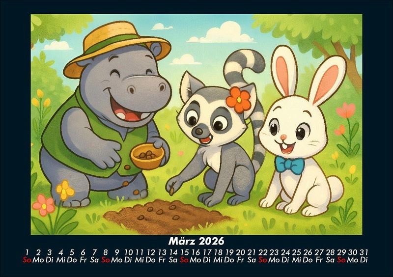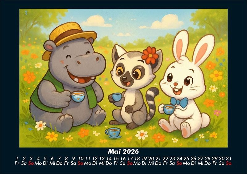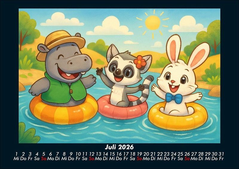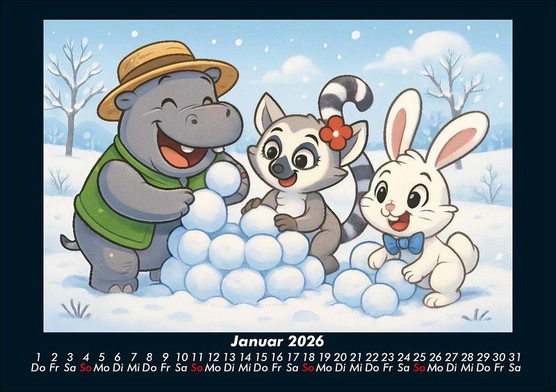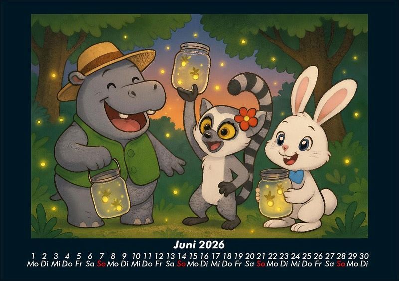 Sash, Lulu & Bouncy - Freunde fürs ganze Jahr 2026 Motivkalender DIN A5 Sash das fröhliche Nilpferd, Lulu die quirlige Lemurendame und Bouncy das energiegeladene Häschen erleben gemeinsam ein kunterbuntes Jahr. Monat für Monat warten neue Abenteuer im bunten Cartoon-Stil - von Schneefort im Januar über Glühwürmchen im Sommer bis zum Lebkuchenhaus im Dezember - immer zu dritt, immer voller Freude. Vero-Kalender Kids zeigen liebevoll gestaltete Monatskalender mit bunten Bild-Motiven tierischer Freunde, die gemeinsam spannende Abenteuer erleben und die Welt entdecken. Ob in fernen Ländern, zwischen berühmten Sehenswürdigkeiten oder in magischen Landschaften - die fröhlichen Tiercharaktere begleiten Kinder Monat für Monat durch ein Jahr voller Fantasie, Freude und Freundschaft. Gedruckt werden die Kinder-Kalender aus dem Vero Verlag auf hochwertigem Kalenderbogen in Premium-Qualität und in verschiedenen Größen.