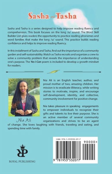 Sasha and Tasha is a series designed to help improve reading fluency and comprehension. This book focuses on the long /u/ sound. The Word Skill Builder List gives readers the opportunity to practice reading phonemes and word families that make the long /u/ sound. This practice builds reading confidence and helps to improve reading fluency. In this installment of Sasha and Tasha, find out the importance of a community garden and self-sustainability. Watch as Tasha recruits and organizes a crew to solve a community problem that reveals the importance of understanding one's purpose. The Yes I Can poem is included to develop a growth-mindset for readers.