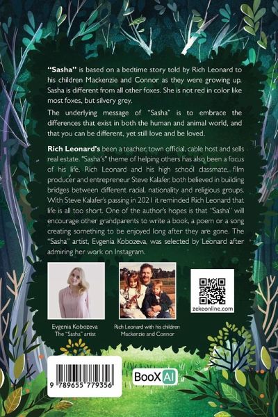 "Sasha" is based on a bedtime story told by Rich Leonard to his children Mackenzie and Connor as they were growing up. Sasha is different from all other foxes. She is not red in color like most foxes, but silvery grey. The underlying message of "Sasha" is to embrace the differences that exist in both the human and animal world, and that you can be different, yet still love and be loved.