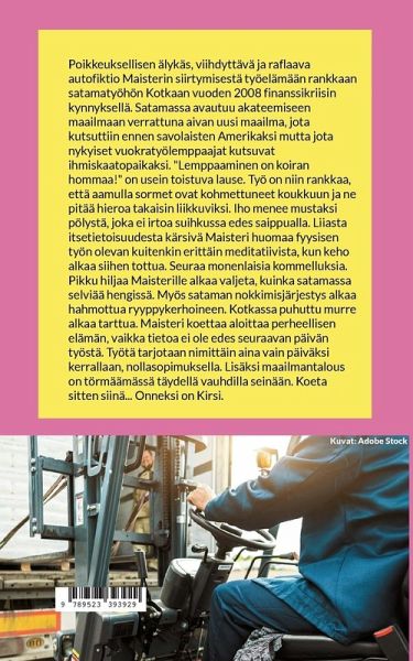 Poikkeuksellisen älykäs, viihdyttävä ja raflaava autofiktio Maisterin siirtymisestä työelämään rankkaan satamatyöhön Kotkaan vuoden 2008 finanssikriisin kynnyksellä. Satamassa avautuu akateemiseen maailmaan verrattuna aivan uusi maailma, jota kutsuttiin ennen savolaisten Amerikaksi mutta jota nykyiset vuokratyölemppaajat kutsuvat ihmiskaatopaikaksi. "Lemppaaminen on koiran hommaa!" on usein toistuva lause. Työ on niin rankkaa, että aamulla sormet ovat kohmettuneet koukkuun ja ne pitää hieroa takaisin liikkuviksi. Iho menee mustaksi pölystä, joka ei irtoa suihkussa edes saippualla. Liiasta itsetietoisuudesta kärsivä Maisteri huomaa fyysisen työn olevan kuitenkin erittäin meditatiivista, kun keho alkaa siihen tottua. Seuraa monenlaisia kommelluksia. Pikku hiljaa Maisterille alkaa valjeta, kuinka satamassa selviää hengissä. Myös sataman nokkimisjärjestys alkaa hahmottua ryyppykerhoineen. Kotkassa puhuttu murre alkaa tarttua. Maisteri koettaa aloittaa perheellisen elämän, vaikka tietoa ei ole edes seuraavan päivän työstä. Työtä tarjotaan nimittäin aina vain päiväksi kerrallaan, nollasopimuksella. Lisäksi maailmantalous on törmäämässä täydellä vauhdilla seinään. Koeta sitten siinä... Onneksi on Kirsi.