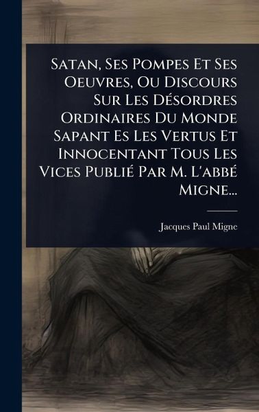 Satan, Ses Pompes Et Ses Oeuvres, Ou Discours Sur Les DÃ(c)sordres Ordinaires Du Monde Sapant Es Les Vertus Et Innocentant Tous Les Vices PubliÃ(c) Par M. L'abbÃ(c) Migne... est un discours thÃ(c)ologique approfondi sur le rÿle de Satan et ses Å"uvres dans le monde. L'ouvrage examine les dÃ(c)sordres du monde qui minent les vertus et innocentent les vices. PubliÃ(c) par M. l'abbÃ(c) Migne, ce livre offre une exploration dÃ(c)taillÃ(c)e de la satanologie dans le contexte de la thÃ(c)ologie chrÃ(c)tienne. Il s'adresse à ceux qui s'intÃ(c)ressent à la doctrine chrÃ(c)tienne et aux Ã(c)tudes religieuses, offrant une analyse des forces spirituelles en jeu dans la vie quotidienne. This work has been selected by scholars as being culturally important, and is part of the knowledge base of civilization as we know it. This work was reproduced from the original artifact, and remains as true to the original work as possible. Therefore, you will see the original copyright references, library stamps (as most of these works have been housed in our most important libraries around the world), and other notations in the work. This work is in the public domain in the United States of America, and possibly other nations. Within the United States, you may freely copy and distribute this work, as no entity (individual or corporate) has a copyright on the body of the work. As a reproduction of a historical artifact, this work may contain missing or blurred pages, poor pictures, errant marks, etc. Scholars believe, and we concur, that this work is important enough to be preserved, reproduced, and made generally available to the public. We appreciate your support of the preservation process, and thank you for being an important part of keeping this knowledge alive and relevant.