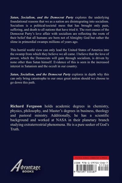 Satan, Socialism, and the Democrat Party explores the underlying foundational reasons that we as a nation are disintegrating into socialism. Socialism is a political/societal mess that has brought only pain, suffering, and death to all nations that have tried it. The root causes of the Democrat Party's love affair with socialism are reflecting the roots of their belief that all humans are born not of Almighty God but rather the slime in primordial swamps millions of years ago. This horrid world view can only lead the United States of America into the swamp from which they believe we all came. I believe that the love of power, which the Democrats will gain through socialism, is driven by none other than Satan himself. Evidence of this is seen in the increased interest in Satanism and the occult in our country. Satan, Socialism, and the Democrat Party explores in depth why this can only bring catastrophe to our once great nation should we choose to go down this path.