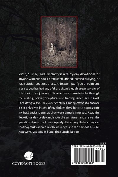 Satan, Suicide, and Sanctuary is a thirty-day devotional for anyone who has had a difficult childhood, battled bullying, or had suicidal ideations or a suicide attempt. If you or someone close to you has had any of these situations, please get a copy of this book. It is a journey of how to overcome obstacles through counseling, prayer, Scripture, and finding sanctuary in God. Each day gives you relevant scriptures and questions to answer. It not only gives insight of my darkest days, but also quotes from my husband and son, as they were directly involved. Read the devotional day by day and savor the scriptures and answer the questions honestly. I have openly shared my darkest days so that hopefully someone else never gets to the point of suicide. As always, you can call 988, the suicide hotline. 1