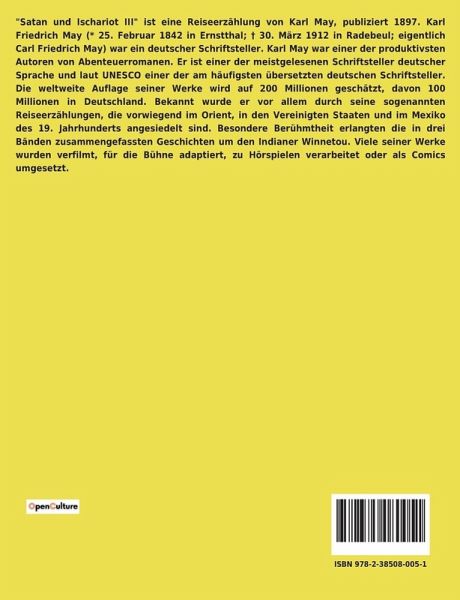 "Satan und Ischariot III" ist eine Reiseerzählung von Karl May, publiziert 1897. Karl Friedrich May (* 25. Februar 1842 in Ernstthal; ¿ 30. März 1912 in Radebeul; eigentlich Carl Friedrich May) war ein deutscher Schriftsteller. Karl May war einer der produktivsten Autoren von Abenteuerromanen. Er ist einer der meistgelesenen Schriftsteller deutscher Sprache und laut UNESCO einer der am häufigsten übersetzten deutschen Schriftsteller. Die weltweite Auflage seiner Werke wird auf 200 Millionen geschätzt, davon 100 Millionen in Deutschland. Bekannt wurde er vor allem durch seine sogenannten Reiseerzählungen, die vorwiegend im Orient, in den Vereinigten Staaten und im Mexiko des 19. Jahrhunderts angesiedelt sind. Besondere Berühmtheit erlangten die in drei Bänden zusammengefassten Geschichten um den Indianer Winnetou. Viele seiner Werke wurden verfilmt, für die Bühne adaptiert, zu Hörspielen verarbeitet oder als Comics umgesetzt.