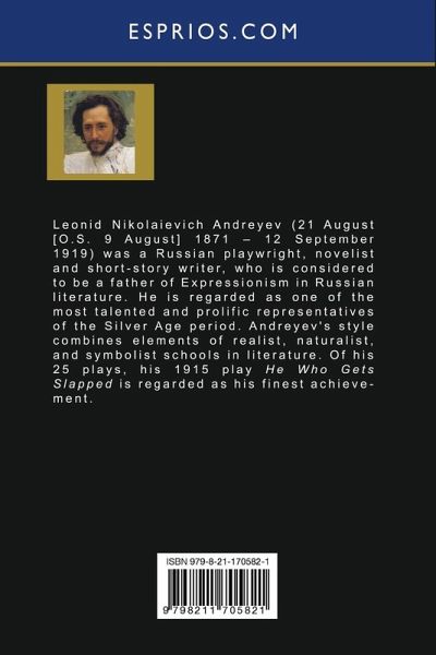 Leonid Nikolaievich Andreyev (21 August [O. S. 9 August] 1871 - 12 September 1919) was a Russian playwright, novelist and short-story writer, who is considered to be a father of Expressionism in Russian literature. He is regarded as one of the most talented and prolific representatives of the Silver Age period. Andreyev's style combines elements of realist, naturalist, and symbolist schools in literature. Of his 25 plays, his 1915 play He Who Gets Slapped is regarded as his finest achievement.