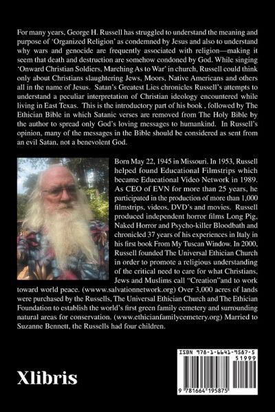 For many years, George H. Russell has struggled to understand the meaning and purpose of 'Organized Religion' as condemned by Jesus and also to understand why wars and genocide are frequently associated with religion-making it seem that death and destruction are somehow condoned by God. While singing 'Onward Christian Soldiers, Marching As to War' in church, Russell could think only about Christians slaughtering Jews, Moors, Native Americans and others all in the name of Jesus. Satan's Greatest Lies chronicles Russell's attempts to understand a peculiar interpretation of Christian ideology encountered while living in East Texas. This is the introductory part of his book , followed by The Ethician Bible in which Satanic verses are removed from The Holy Bible by the author to spread only God's loving messages to humankind. In Russell's opinion, many of the messages in the Bible should be considered as sent from an evil Satan, not a benevolent God.