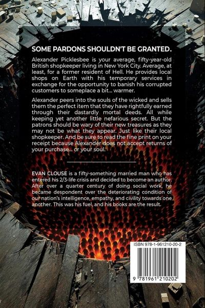 SOME PARDONS SHOULDN'T BE GRANTED. Alexander Picklesbee is your average, fifty-year-old British shopkeeper living in New York City. Average, at least, for a former resident of Hell. He provides local shops on Earth with his temporary services in exchange for the opportunity to banish his corrupted customers to someplace a bit... warmer. Alexander peers into the souls of the wicked and sells them the perfect item that they have rightfully earned through their dastardly mortal deeds. All while keeping yet another little nefarious secret. But the patrons should be wary of their new treasures as they may not be what they appear. Just like their local shopkeeper. And be sure to read the fine print on your receipt because Alexander does not accept returns of your purchase... or your soul.