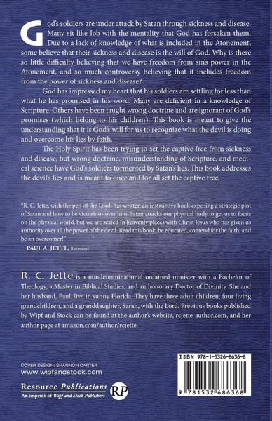 God's soldiers are under attack by Satan through sickness and disease. Many sit like Job with the mentality that God has forsaken them. Due to a lack of knowledge of what is included in the Atonement, some believe that their sickness and disease is the will of God. Why is there so little difficulty believing that we have freedom from sin's power in the Atonement, and so much controversy believing that it includes freedom from the power of sickness and disease? God has impressed my heart that his soldiers are settling for less than what he has promised in his word. Many are deficient in a knowledge of Scripture. Others have been taught wrong doctrine and are ignorant of God's promises (which belong to his children). This book is meant to give the understanding that it is God's will for us to recognize what the devil is doing and overcome his lies by faith. The Holy Spirit has been trying to set the captive free from sickness and disease, but wrong doctrine, misunderstanding of Scripture, and medical science have God's soldiers tormented by Satan's lies. This book addresses the devil's lies and is meant to once and for all set the captive free. ""R. C. Jette, with the pen of the Lord, has written an instructive book exposing a strategic plot of Satan and how to be victorious over him. Satan attacks our physical body to get us to focus on the physical world, but we are seated in heavenly places with Christ Jesus who has given us authority over all the power of the devil. Read this book, be educated, contend for the faith, and be an overcomer!"" --Paul A. Jette, Reverend R. C. Jette is a nondenominational ordained minister with a Bachelor of Theology, a Master in Biblical Studies, and an honorary Doctor of Divinity. She and her husband, Paul, live in sunny Florida. They have three adult children, four living grandchildren, and a granddaughter, Sarah, with the Lord. Previous books published by Wipf and Stock can be found at the author's website, rcjette-author.com, and her author page at amazon.com/author/rcjette.