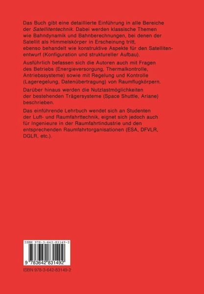 1 Bedeutung der Raumfahrt.- 1.1 Die zweidimensionale Erschließung unseres Lebensraums.- 1.2 Die dreidimensionale Erschließung unseres Lebensraums.- 1.3 Die bedeutendsten Raumfahrtprojekte.- 1.4 Die Umgebungsbedingungen im Weltraum.- 2 Bahndynamik.- 2.1 Ballistischer Flug.- 2.2 Bahnänderungsmanöver.- 2.3 Bahnbestimmung.- 2.4 Kreisförmige Bahnen.- 2.5 Interplanetare Flüge.- 3 Bahnstörungen.- 3.1 Abplattung der Erde.- 3.2 Ungleichförmige Massenverteilung der Erde.- 3.3 Gravitationseinflüsse von Sonne und Mond.- 3.4 Sonnendruck.- 3.5 Restatmosphäre.- 4 Satellitenkonfiguration.- 4.1 Interface: Satellit Trägersystem.- 4.2 Das System Satellit?.- 5 Struktur.- 5.1 Statische und dynamische Lastannahmen.- 5.2 Strukturbauteile.- 5.3 Strukturanalyse.- 6 Energieversorgung.- 6.1 Solarzellen.- 6.2 Batterien.- 6.3 Zusammenwirken von Batterie und Solarzellen.- 6.4 Spannungsregelung.- 7 Nachrichtenübertragung.- 7.1 Telemetrie und Telekommando.- 7.2 Computer.- 7.3 Pulscodemodulator/-demodulator.- 7.4 Frequenzumsetzung und Modulation.- 7.5 Leistungsverstärker/Empfanger.- 7.6 Antennenübertragungsstrecke.- 7.7 Entfernungsmessungen.- 7.8 Richtungsmessungen.- 8 Thermalkontrolle.- 8.1 Aufgaben.- 8.2 Grundlagen.- 8.3 Technische Lösungen.- 9 Lageregelung.- 9.1 Dreiachsenstabilisierung..- 9.2 Drallstabilisierung.- 9.3 Äußere Störmomente.- 9.4 Stellglieder.- 10 Antriebssysteme.- 10.1 Abschätzende Berechnungsverfahren.- 10.2 Feststoffantriebe.- 10.3 Kaltgassysteme.- 10.4 Heißgassysteme.- 10.5 Elektrische Antriebssysteme.- 10.6 Tanks.- 11 Zuverlässigkeitsberechnung.- Verzeichnis der Abkürzungen der im Buch erwähnten Satellitenprojekte.- Weiterführende Literatur.