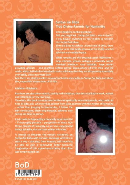 Sathya Sai BabaTrue Divine Parents for HumanityDears Readers, cordial greetings.Still, you might ask: 'Sathya Sai Baba - who is that?!'If you haven't switched on your mobile to research him in the first place.Since Sai Baba has left his 'mortal coils' in 2011, there seems to be less public discussion on his life and his spiritual and worldly legacy.What remains are the amazing social institutions - large ashrams, schools, colleges, a university, world-standard maximum care hospitals, huge water-providing projects - and countless selfless-service organisations all over India and the world, which Sai Baba has founded in such a solid way that they are all operating sucessfully even today, about ten years later.And there are almost endless amounts of books and media on Sathya Sai Baba and about the 'impossible' divine feats of his life.A Matter of BalanceBut there are also other reports, mainly in the internet, that decry Sai Baba's work, actions and intentions in very low ways.Therefore, this book has now been written for spiritually interested people, who prefer to hear all sides out, who truly had contact from close quarters with this Avatar of Humanity - rather than jumping to spectacular, if below the belt conclusions, often long-distance, without ever seeing Sai Baba in person.It is in order to help setting a hopefully more impartial - if thoroughly personal - perspective on these True Divine Parents of Humanity, as we have experienced Sathya Sai Baba, that we have written this book. It intends to integrate the various narrations on Sathya Sai Baba with our own exchange with him in such a way - that you, Dear Readers, will hopefully be able to gain a somewhat better balanced imagination of this super-human being that often was simply called Sai.