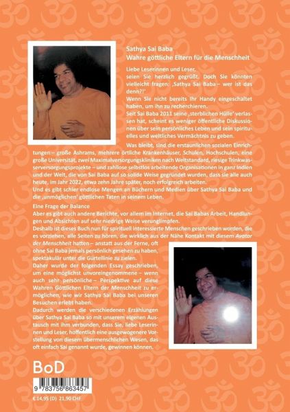 Sathya Sai BabaWahre göttliche Eltern für die MenschheitLiebe Leserinnen und Leser, seien Sie herzlich gegrüßt. Doch Sie könnten vielleicht fragen: "Sathya Sai Baba - wer ist das denn?!"Wenn Sie nicht bereits Ihr Handy eingeschaltet haben, um ihn zu recherchieren. Seit Sai Baba 2011 seine "sterblichen Hülle" verlassen hat, scheint es weniger öffentliche Diskussionen über sein persönliches Leben und sein spirituelles und weltliches Vermächtnis zu geben. Was bleibt, sind die erstaunlichen sozialen Einrichtungen - große Ashrams, mehrere örtliche Krankenhäuser, Schulen, Hochschulen, eine große Universität, zwei Maximalversorgungskliniken nach Weltstandard, riesige Trinkwasserversorgungsprojekte - und zahllose selbstlos arbeitende Organisationen in ganz Indien und der Welt, die von Sai Baba auf so solide Weise gegründet wurden, dass sie alle auch heute, im Jahr 2022, etwa zehn Jahre später, noch erfolgreich arbeiten. Und es gibt schier endlose Mengen an Büchern und Medien über Sathya Sai Baba und die "unmöglichen" göttlichen Taten in seinem Leben.Eine Frage der BalanceAber es gibt auch andere Berichte, vor allem im Internet, die Sai Babas Arbeit, Handlungen und Absichten auf sehr niedrige Weise verunglimpfen. Deshalb ist dieses Buch nun für spirituell interessierte Menschen geschrieben worden, die es vorziehen, alle Seiten zu hören, die wirklich aus der Nähe Kontakt mit diesem Avatar der Menschheit hatten - anstatt aus der Ferne, oft ohne Sai Baba jemals persönlich gesehen zu haben, spektakulär unter die Gürtellinie zu zielen. Daher wurde der folgende Essay geschrieben, um eine möglichst unvoreingenommene - wenn auch sehr persönliche - Perspektive auf diese Wahren Göttlichen Eltern der Menschheit zu ermöglichen, wie wir Sathya Sai Baba bei unseren Besuchen erlebt haben. Dadurch werden die verschiedenen Erzählungen über Sathya Sai Baba so mit unserem eigenen Austausch mit ihm verbunden, dass Sie, liebe Leserinnen und Leser, hoff entlich eine ausgewogenere Vorstellung von diesem übermenschlichen Wesen, das oft einfach Sai genannt wurde, gewinnen können.