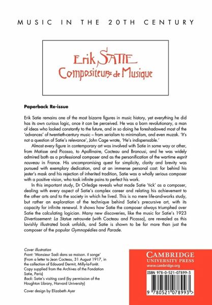 Erik Satie remains one of the most bizarre figures in music history, yet everything he did has its own curious logic, once it can be perceived. In this important new study Dr Orledge reveals what made Satie 'tick' as a composer, dealing with every aspect of Satie's complex career and relating his achievement to the other arts and to the society in which he lived. Almost every figure in contemporary art was involved with Satie in some way or another, from Matisse and Picasso to Apollinaire, Cocteau and Brancusi. This, however, is no mere life-and-works study but rather an exploration of the technique behind Satie's art, which foreshadowed most of the 'advances' of twentieth-century music from serialism to minimalism, and even muzak. As the book progresses Satie appears as far more than just the composer of the popular Gymnopédies and Parade.