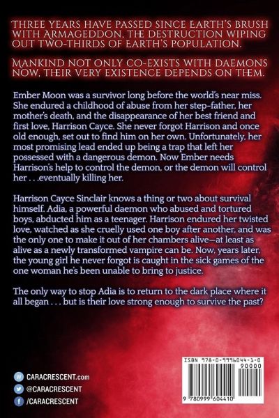 Three years have passed since Earth’s brush with Armageddon, the destruction wiping out two-thirds of Earth’s population. Mankind not only co-exists with daemons now, their very existence depends on them. Ember Moon was a survivor long before the world’s near miss. She endured a childhood of abuse from her step-father, her mother’s death, and the disappearance of her best friend and first love, Harrison Cayce. She never forgot Harrison and once old enough, set out to find him on her own. Unfortunately, her most promising lead was a trap that left her possessed with a dangerous demon. Now Ember needs Harrison’s help to control the demon, or the demon will control her . . .eventually killing her. Harrison Cayce Sinclair knows a thing or two about survival himself. Adia, a powerful daemon who abused and tortured boys, abducted him as a teenager. Harrison endured her twisted love, watched as she cruelly used one boy after another, and was the only one to make it out of her chambers alive—at least as alive as a newly transformed vampire can be. Now, years later, the young girl he never forgot is caught in the sick games of the one woman he’s been unable to bring to justice. The only way to stop Adia is to return to the dark place where it all began . . . but is their love strong enough to survive the past?