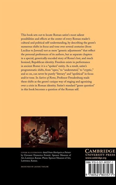 This survey of Roman satire locates its most salient possibilities and effects at the center of every Roman reader's cultural and political self-understanding. This book describes the genre's numerous shifts in focus and tone over several centuries (from Lucilius to Juvenal) not as mere 'generic adjustments' that reflect the personal preferences of its authors, but as separate chapters in a special, generically encoded story of Rome's lost, and much lionized, Republican identity. Freedom exists in performance in ancient Rome: it is a 'spoken' entity. As a result, satire's programmatic shifts, from 'open' to 'understated' to 'cryptic' and so on, can never be purely 'literary' and 'apolitical' in focus and/or tone. In Satires of Rome, Professor Freudenburg reads these shifts as the genre's unique way of staging and agonizing over a crisis in Roman identity. Satire's standard 'genre question' in this book becomes a question of the Roman self.