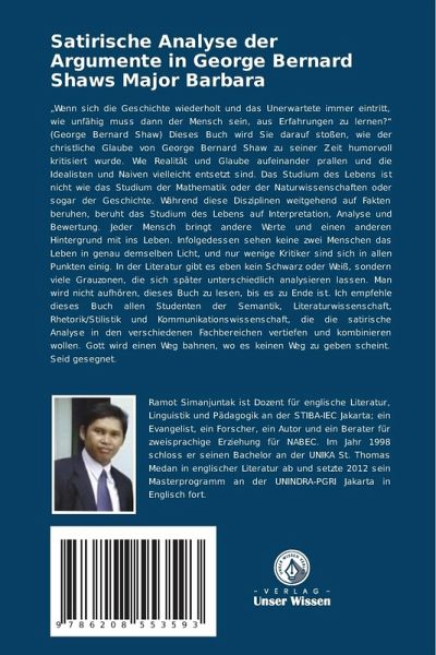 "Wenn sich die Geschichte wiederholt und das Unerwartete immer eintritt, wie unfähig muss dann der Mensch sein, aus Erfahrungen zu lernen?" (George Bernard Shaw) Dieses Buch wird Sie darauf stoßen, wie der christliche Glaube von George Bernard Shaw zu seiner Zeit humorvoll kritisiert wurde. Wie Realität und Glaube aufeinander prallen und die Idealisten und Naiven vielleicht entsetzt sind. Das Studium des Lebens ist nicht wie das Studium der Mathematik oder der Naturwissenschaften oder sogar der Geschichte. Während diese Disziplinen weitgehend auf Fakten beruhen, beruht das Studium des Lebens auf Interpretation, Analyse und Bewertung. Jeder Mensch bringt andere Werte und einen anderen Hintergrund mit ins Leben. Infolgedessen sehen keine zwei Menschen das Leben in genau demselben Licht, und nur wenige Kritiker sind sich in allen Punkten einig. In der Literatur gibt es eben kein Schwarz oder Weiß, sondern viele Grauzonen, die sich später unterschiedlich analysieren lassen. Man wird nicht aufhören, dieses Buch zu lesen, bis es zu Ende ist. Ich empfehle dieses Buch allen Studenten der Semantik, Literaturwissenschaft, Rhetorik/Stilistik und Kommunikationswissenschaft, die die satirische Analyse in den verschiedenen Fachbereichen vertiefen und kombinieren wollen. Gott wird einen Weg bahnen, wo es keinen Weg zu geben scheint. Seid gesegnet.