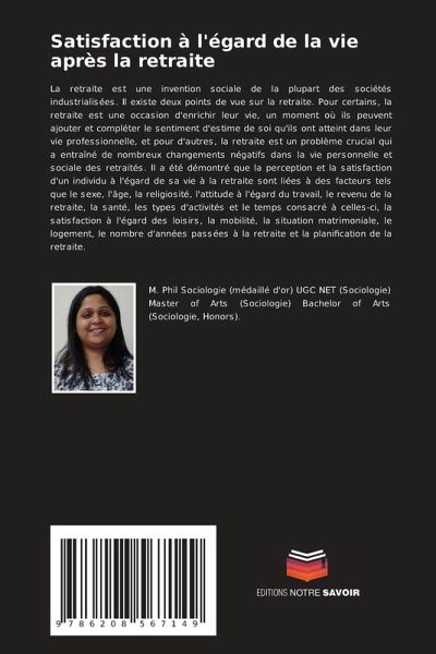 La retraite est une invention sociale de la plupart des sociétés industrialisées. Il existe deux points de vue sur la retraite. Pour certains, la retraite est une occasion d'enrichir leur vie, un moment où ils peuvent ajouter et compléter le sentiment d'estime de soi qu'ils ont atteint dans leur vie professionnelle, et pour d'autres, la retraite est un problème crucial qui a entraîné de nombreux changements négatifs dans la vie personnelle et sociale des retraités. Il a été démontré que la perception et la satisfaction d'un individu à l'égard de sa vie à la retraite sont liées à des facteurs tels que le sexe, l'âge, la religiosité, l'attitude à l'égard du travail, le revenu de la retraite, la santé, les types d'activités et le temps consacré à celles-ci, la satisfaction à l'égard des loisirs, la mobilité, la situation matrimoniale, le logement, le nombre d'années passées à la retraite et la planification de la retraite.