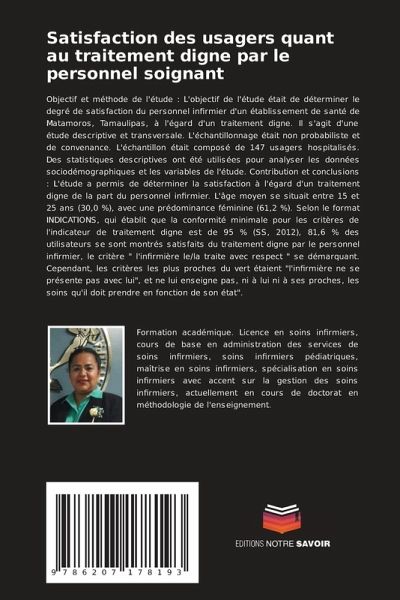 Objectif et méthode de l'étude : L'objectif de l'étude était de déterminer le degré de satisfaction du personnel infirmier d'un établissement de santé de Matamoros, Tamaulipas, à l'égard d'un traitement digne. Il s'agit d'une étude descriptive et transversale. L'échantillonnage était non probabiliste et de convenance. L'échantillon était composé de 147 usagers hospitalisés. Des statistiques descriptives ont été utilisées pour analyser les données sociodémographiques et les variables de l'étude. Contribution et conclusions : L'étude a permis de déterminer la satisfaction à l'égard d'un traitement digne de la part du personnel infirmier. L'âge moyen se situait entre 15 et 25 ans (30,0 %), avec une prédominance féminine (61,2 %). Selon le format INDICATIONS, qui établit que la conformité minimale pour les critères de l'indicateur de traitement digne est de 95 % (SS, 2012), 81,6 % des utilisateurs se sont montrés satisfaits du traitement digne par le personnel infirmier, le critère " l'infirmière le/la traite avec respect " se démarquant. Cependant, les critères les plus proches du vert étaient "l'infirmière ne se présente pas avec lui", et ne lui enseigne pas, ni à lui ni à ses proches, les soins qu'il doit prendre en fonction de son état".