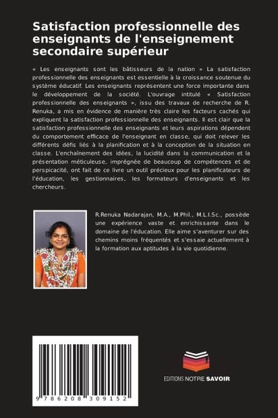 « Les enseignants sont les bâtisseurs de la nation » La satisfaction professionnelle des enseignants est essentielle à la croissance soutenue du système éducatif. Les enseignants représentent une force importante dans le développement de la société. L'ouvrage intitulé « Satisfaction professionnelle des enseignants », issu des travaux de recherche de R. Renuka, a mis en évidence de manière très claire les facteurs cachés qui expliquent la satisfaction professionnelle des enseignants. Il est clair que la satisfaction professionnelle des enseignants et leurs aspirations dépendent du comportement efficace de l'enseignant en classe, qui doit relever les différents défis liés à la planification et à la conception de la situation en classe. L'enchaînement des idées, la lucidité dans la communication et la présentation méticuleuse, imprégnée de beaucoup de compétences et de perspicacité, ont fait de ce livre un outil précieux pour les planificateurs de l'éducation, les gestionnaires, les formateurs d'enseignants et les chercheurs.