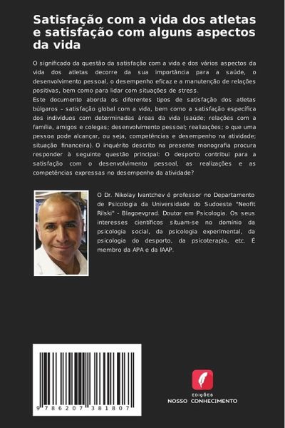 O significado da questão da satisfação com a vida e dos vários aspectos da vida dos atletas decorre da sua importância para a saúde, o desenvolvimento pessoal, o desempenho eficaz e a manutenção de relações positivas, bem como para lidar com situações de stress.Este documento aborda os diferentes tipos de satisfação dos atletas búlgaros - satisfação global com a vida, bem como a satisfação específica dos indivíduos com determinadas áreas da vida (saúde; relações com a família, amigos e colegas; desenvolvimento pessoal; realizações; o que uma pessoa pode alcançar, ou seja, competências e desempenho na atividade; situação financeira). O inquérito descrito na presente monografia procura responder à seguinte questão principal: O desporto contribui para a satisfação com o desenvolvimento pessoal, as realizações e as competências expressas no desempenho da atividade?