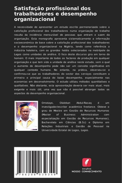 A necessidade de apresentar um estudo escrito pormenorizado sobre a satisfação profissional dos trabalhadores numa organização de trabalho resulta da incidência mensurável de pessoas que entram e saem da organização. Esta monografia apresenta sistematicamente a informação socioeconómica de base sobre a satisfação profissional dos trabalhadores e o desempenho organizacional na Nigéria, tendo como referência a indústria hoteleira, com os grandes hotéis selecionados na metrópole de Lagos como unidades de análise. O foco deste discurso gira em torno do homem. O mais importante de todos os factores de produção em qualquer organização e que tem sido a unidade de análise neste estudo, sem o qual o aumento do desempenho pode não ser um conceito significativo em qualquer contexto humano. No entanto, na prática, observou-se e confirmou-se que os trabalhadores do sector dos serviços constituem a primeira e principal causa do baixo desempenho, especialmente nas economias em desenvolvimento. O estudo utilizou métodos quantitativos e qualitativos. Não obstante, esta apresentação deveria ser mais atual, mais exigente e mais útil, uma vez que não é possível abranger todos os aspectos do desempenho organizacional.