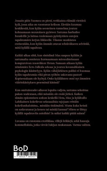 Jossain päin Suomea on pieni, verkkaista elämää viettävä kylä, jossa aika on ruostunut kelloon. Eletään kuumaa keskikesää, kun kylän seesteinen tunnelma joutuu kohtaamaan muutoksen pyörteet. Sattuma harhailee huudeille ja laittaa tuulemaan pyöräyttäen outojen tapahtumien ketjun liikkeelle. Tilanne mutkistuu entisestään, kun kylän ämmät ottavat tehtäväkseen selvittää, mitä kylällä tapahtuu. Kaikki alkaa siitä, kun sinisilmä Max saapuu kylään ja sattumalta onnistuu hurmaamaan miessuhteissaan kompuroivan nuorehkon Hetan. Samaan aikaan kylän nimismies Eero Julkula sekoaa ja joutuu kovanahkaisen psykologin käsittelyyn. Kylän vähäjärkinen poliisi ei huomaa kylän tapahtumia eikä pirun työhön uskovasta pastori Kopisestakaan ole hyötyä. Onko kyläläisten onni nyt ämmien väärinkäsityksen pesemissä käsissä? Kun omituisuudet alkavat lopulta valjeta, sattuma sekoittaa pakan uudestaan, eikä missään ole enää järkeä. Kaiken tämän epäonnisen sotkun keskellä Heta, Max ja kylähullu Lahikainen kokeilevat seksuaalisia rajojaan erittäin kokeilunhaluisina... mistään tinkimättä. Mutta kuka heistä on sotkeutunut ja kenen tai minkä kanssa? Miten se liittyy kylällä tapahtuviin asioihin? Ja miksi kaikki pitää salata? Luvassa on estotonta erotiikkaa, villejä leikkejä, hassuja kommelluksia. Varma valinta.