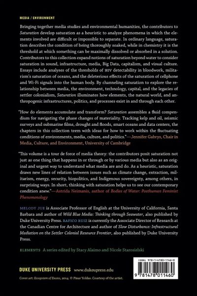 Bringing together media studies and environmental humanities, the contributors to Saturation develop saturation as a heuristic to analyze phenomena in which the elements involved are difficult or impossible to separate. In ordinary language, saturation describes the condition of being thoroughly soaked, while in chemistry it is the threshold at which something can be maximally dissolved or absorbed in a solution. Contributors to this collection expand notions of saturation beyond water to consider saturation in sound, infrastructure, media, Big Data, capitalism, and visual culture. Essays include analyses of the thresholds of HIV detectability in bloodwork, militarism's saturation of oceans, and the deleterious effects of the saturation of cellphone and wi-fi signals into the human body. By channeling saturation to explore the relationship between media, the environment, technology, capital, and the legacies of settler colonialism, Saturation illuminates how elements, the natural world, and anthropogenic infrastructures, politics, and processes exist in and through each other. Contributors. Marija Cetini¿, Jeff Diamanti, Bishnupriya Ghosh, Lisa Yin Han, Stefan Helmreich, Mél Hogan, Melody Jue, Rahul Mukherjee, Max Ritts, Rafico Ruiz, Bhaskar Sarkar, John Shiga, Avery Slater, Janet Walker, Joanna Zylinska