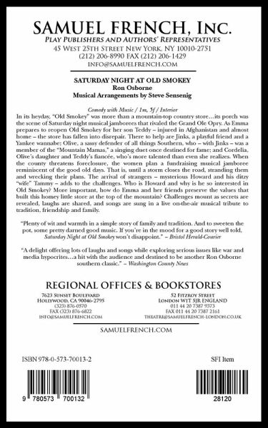 Category: Comedy with Music Characters: 1 male, 5 females Scenery: Interior In its heyday, "Old Smokey" was more than a mountain-top country store...its porch was the scene of Saturday night musical jamborees that rivaled the Grand Ole Opry. As Emma prepares to reopen Old Smokey for her son Teddy - injured in Afghanistan and almost home - the store has fallen into disrepair. There to help are Jinks, a playful friend and a Yankee wannabe; Olive, a sassy defender of all