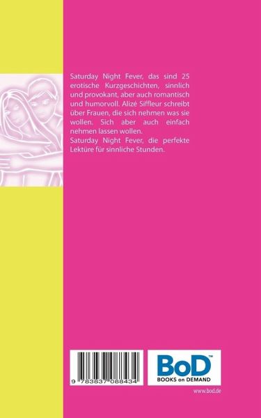 Bella erlebt zum ersten Mal eine Ménage-à-trois. Sinja besucht einen ganz besonderen Club. Sarah und Jan treffen sich, um Sex in der Sauna zu haben. Tom lernt über ein Casual Dating Portal eine Unbekannte kennen und erlebt eine Überraschung.Saturday Night Fever, das sind 24 erotische Kurzgeschichten, sinnlich und provokant, aber auch romantisch und humorvoll. Alizé Siffleur schreibt über Frauen, die sich nehmen was sie wollen. Sich aber auch einfach nehmen lassen wollen.Saturday Night Fever, die perfekte Lektüre für sinnliche Stunden.