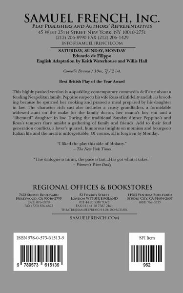 Dramatic Comedy / Characters: 10 male, 7 female Scenery: 2 interiors This highly praised version is a sparkling contemporary commedia dell'arte about a feuding Neapolitan family. Peppino suspects his wife Rosa of infidelity and she is brooding because he spurned her cooking and praised a meal prepared by his daughter in law. The character rich cast also includes a crusty grandfather, a formidable widowed aunt on the make for the family doctor, her mama's boy son and a "liberated" daughter i