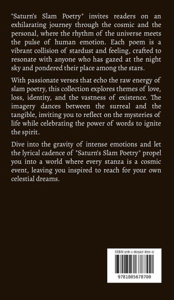 "Saturn's Slam Poetry" invites readers on an exhilarating journey through the cosmic and the personal, where the rhythm of the universe meets the pulse of human emotion. Each poem is a vibrant collision of stardust and feeling, crafted to resonate with anyone who has gazed at the night sky and pondered their place among the stars. With passionate verses that echo the raw energy of slam poetry, this collection explores themes of love, loss, identity, and the vastness of existence. The imagery dances between the surreal and the tangible, inviting you to reflect on the mysteries of life while celebrating the power of words to ignite the spirit. Dive into the gravity of intense emotions and let the lyrical cadence of "Saturn's Slam Poetry" propel you into a world where every stanza is a cosmic event, leaving you inspired to reach for your own celestial dreams.