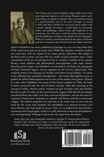 Satyr is Huidobro's last novel, published in Santiago in 1939, at a time when little of his work was in print in his native land. While that situation would be rectified two years later, with the release of two major poetry collections, this volume is his final work in prose, and one that has mostly escaped attention since. Closer examination of the text reveals however that it contains a number of the author's literary, social, political and philosophical preoccupations, with many themes from his poems, essays, and manifestos re-occurring in the book, the protagonist of which, Bernardo Saguen, may be regarded on one level as a failed artist. This would-be writer is one that goes to the bad, and whose mental collapse - he seems to be suffering from paranoid schizophrenia - and moral disintegration seem to parallel the kind of disintegration seen in some of the author's later poems. Written at a time when Huidobro was unsure of his literary position in Chile, the book is much concerned with the idea of poetic creation, while also worrying at the concept of reality, whether artistic creations are part of reality itself, and whether the artist himself is part of reality. As the novel proceeds, Saguen finds himself increasingly untethered from that reality as he has a nervous breakdown, only for his return to a measure of sanity and composure to coincide with horror, and then total mental collapse. The reader's sympathies lie with him at the outset, but we have only his word for the events that transpire; his unreliability as a narrator becomes ever more obvious, and clues begin to mount. Have we, as readers been deceived by a monstrous and amoral egoist, or have we really observed a total mental breakdown, as it was happening? Nothing is clear at the end, apart from the horror.