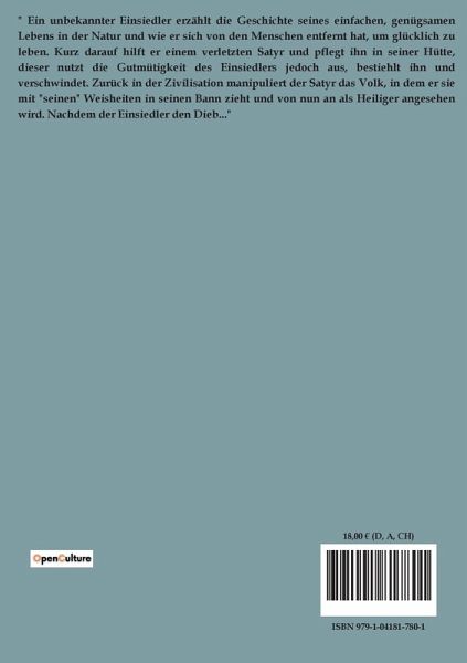"Satyros oder Der vergötterte Waldteufel" von Johann Wolfgang Goethe - Eine mythische Reise in die Welt der antiken Götter Begeben Sie sich mit "Satyros oder Der vergötterte Waldteufel" auf eine mythische Reise, ein faszinierendes Werk des renommierten deutschen Autors Johann Wolfgang Goethe. Diese fesselnde Erzählung taucht tief in die mystische Welt der antiken Götter und das intrigierende Konzept der menschlich-göttlichen Interaktion ein. Im Zentrum dieser Erzählung präsentiert Goethe eine faszinierende Erforschung des Satyrs, einer Kreatur aus der griechischen Mythologie, die oft mit Dionysos, dem Gott des Weins, der Freude und des Festes, in Verbindung gebracht wird. Die Geschichte entfaltet sich aus der Perspektive dieser halbmenschlichen, halbbestialischen Kreatur, deren Erfahrungen und Interaktionen eine einzigartige Perspektive auf das Göttliche und das Irdische bieten und einen nuancierten Kommentar zur Beziehung zwischen Menschen und Göttern und dem zarten Gleichgewicht zwischen irdischen Begierden und göttlichen Eingriffen liefern. Die Reise des Satyrs, seine Begegnungen mit anderen Göttern und Sterblichen und seine Transformation im Laufe der Erzählung beleuchten die Komplexität der göttlich-menschlichen Beziehungen und den starken Einfluss dieser Entitäten auf das Schicksal und die Bestrebungen der Menschen. "Satyros oder Der vergötterte Waldteufel" steht als Zeugnis für Goethes schriftstellerisches Können, sein tiefes Verständnis der antiken Mythologie und seine Fähigkeit, packende Erzählungen um komplexe Themen zu weben. Dieses Werk, durchdrungen von Goethes Einsicht und philosophischen Grundlagen, bietet eine zum Nachdenken anregende Erforschung der menschlichen Verfassung im Bereich des Göttlichen. Ob Sie ein Fan der griechischen Mythologie sind, sich für die Erforschung menschlich-göttlicher Dynamiken interessieren oder ein begeisterter Leser von Goethes Werk sind, "Satyros oder Der vergötterte Waldteufel" verspricht ein aufschlussreiches und fesselndes Leseerlebnis zu werden. Schlüsselwörter: Satyros oder Der vergötterte Waldteufel, Johann Wolfgang Goethe, griechische Mythologie, Satyr, Dionysos, menschlich-göttliche Interaktion, klassische Literatur, philosophische Einsicht.
