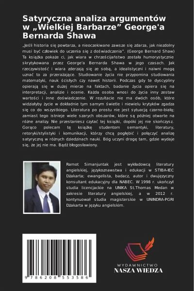 "Je¿li historia si¿ powtarza, a nieoczekiwane zawsze si¿ zdarza, jak niezdolny musi by¿ cz¿owiek do uczenia si¿ z do¿wiadczenia". (George Bernard Shaw) Ta ksi¿¿ka pokäe ci, jak wiara w chrze¿cijästwo zostäa humorystycznie skrytykowana przez George'a Bernarda Shawa w jego czasach. Jak rzeczywisto¿¿ i wiara zderzaj¿ si¿ ze sob¿, a idealistyczni i naiwni mog¿ uznä to za przeräaj¿ce. Studiowanie ¿ycia nie przypomina studiowania matematyki, nauk ¿cis¿ych czy nawet historii. Podczas gdy te dyscypliny opieraj¿ si¿ w du¿ej mierze na faktach, badanie ¿ycia opiera si¿ na interpretacji, analizie i ocenie. Käda osoba wnosi do ¿ycia inny zestaw warto¿ci i inne do¿wiadczenie. W rezultacie nie ma dwóch osób, które widziäyby ¿ycie w dok¿adnie tym samym ¿wietle i niewielu krytyków zgadza si¿ co do wszystkiego. Literatura po prostu nie jest sytuacj¿ czarno-biä¿; zamiast tego istnieje wiele szarych obszarów, które s¿ pó¿niej otwarte na ró¿ne analizy. Nie przestaniesz czytä tej ksi¿¿ki, dopóki jej nie sko¿czysz. Gor¿co polecam t¿ ksi¿¿k¿ studentom semantyki, literatury, retoryki/stylistyki i komunikacji, którzy chc¿ pog¿¿bi¿ i po¿¿czy¿ analiz¿ satyryczn¿ w ró¿nych dziedzinach nauki. Bóg uczyni drog¿ tam, gdzie wydaje si¿, ¿e jej nie ma. B¿d¿ b¿ogos¿awiony.