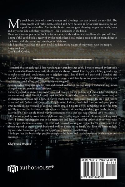 My cook book deals with mostly sauces and dressings that can be used on any dish. Too often people will make meat, seafood and have no idea as far as what sauces to put on top of the main dish. Also in this book there are great dressings to put on salads, beets and any other side dish that you prepare. This is discussed in the book. There are some recipes in the book as far as soups, salads and some main dishes that you will find. I hope if this cook book is received by the public then I will make a cook book on main dishes in the future with the sauces and dressings in this book. I do hope that you enjoy this cook book and have many nights of enjoyment with the recipes. Enjoy cooking! Chef Frank Orofino