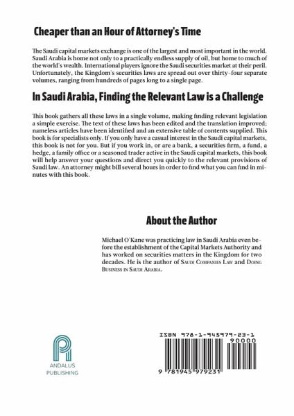Cheaper than an Hour of Attorney's Time The Saudi capital markets exchange is one of the largest and most important in the world. Saudi Arabia is home not only to a practically endless supply of oil, but home to much of the world's wealth. International players ignore the Saudi securities market at their peril. Unfortunately, the Kingdom's securities laws are spread out over thirty-four separate volumes, ranging from hundreds of pages long to a single page. In Saudi Arabia, finding the relevant law is a challenge. This book gathers all these laws in a single volume, making finding relevant legislation a simple exercise. The text of these laws has been edited and the translation improved; nameless articles have been identified and an extensive table of contents supplied. This book is for specialists only. If you only have a casual interest in the Saudi capital markets, this book is not for you. But if you work in, or are a bank, a securities firm, a fund, a hedge, a family office or a seasoned trader active in the Saudi capital markets, this book will help answer your questions and direct you quickly to the relevant provisions of Saudi law. ¿¿¿¿¿¿¿An attorney might bill several hours in order to find what you can find in minutes with this book. The print version containing all Saudi securities laws in one volume--an essential finding tool not available anywhere else. This tool contains all Saudi securities laws and an expanded glossary. With this tool, it is now possible to search all Saudi securities laws at once. Much cheaper than hiring a lawyer to perform legal research--this book pays for itself the first time you use it.