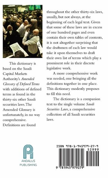 This dictionary is based on the Saudi Capital Markets Authority's Amended Glossary of Defined Terms with additions of defined terms as found in the thirty-six other Saudi securities laws. The Amended Glossary is unfortunately, in no way comprehensive. Definitions are found throughout the other thirty-six laws, usually, but not always, at the beginning of each legal text. Given that some of these laws are in excess of one hundred pages and even contain their own tables of contents, it is not altogether surprising that the draftsmen of each law would take it upon themselves to draft their own list of terms which play a prominent role in their discrete legislative work. A more comprehensive work was needed, one bringing all the definitions together in one place. This dictionary modestly proposes to fill this need. The dictionary is a companion text to the single volume Saudi Securities Laws, a comprehensive collection of all Saudi securities laws.