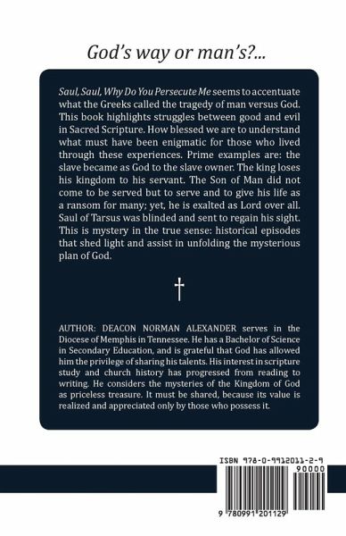 Saul, Saul, Why Do You Persecute Me seems to accentuate what the Greeks called the tragedy of man versus God. This book highlights struggles between good and evil in Sacred Scripture. How blessed we are to understand what must have been enigmatic for those who lived through these experiences. Prime examples are: the slave became as God to the slave owner. The king loses his kingdom to his servant. The Son of Man did not come to be served but to serve and to give his life as a ransom for many; yet, he is exalted as Lord over all. Saul of Tarsus was blinded and sent to regain his sight. This is mystery in the true sense: historical episodes that shed light and assist in unfolding the mysterious plan of God.