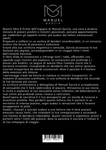 Questo libro nasce da un'idea di Manuel García, una vera e propria miniera di piaceri proibiti e incontri passionali, pensata appositamente per soddisfare gli appetiti erotici più audaci dei lettori adulti omosessuali.Preparatevi a tuffarvi in un vortice di desideri inconfessabili, in un universo erotico che brucia di passione e seduzione. Grazie alla sua scrittura magnetica e sensuale, García accarezza le vostre fantasie più segrete, accompagnandovi in un viaggio oltre i limiti dell'intimità maschile.Il libro sfida le convenzioni e infrange tutti i tabù, offrendo uno sguardo agli incontri più esplosivi, ai legami più profondi e ai piaceri più estatici. Le pagine di questo libro rivelano storie che vi terranno incantati, risvegliando un desiderio che non potrete ignorare.Lasciatevi trasportare da mondi sconosciuti, dove il peccato è il motore delle emozioni più intense. I personaggi creati da García si rivelano in incontri trasgressivi, in momenti di passione sconfinata, in una sinfonia di desiderio che accende le vostre fantasie più oscure.La scrittura provocatoria e dettagliata di Manuel García è un'esplosione di sensualità che vi farà rabbrividire di piacere. Attraverso le sue storie, vi invita a esplorare la vostra sessualità senza inibizioni, ad abbandonarvi ai vostri istinti più profondi senza rimorsi o restrizioni.Quest'opera di narrativa è il vostro passaporto per un mondo di lussuria e avventure proibite. Non perdetevi questa lettura che vi porterà in un territorio di piacere intenso, sogni audaci e sensazioni che vi faranno accapponare la pelle.Sedetevi, rilassatevi e lasciatevi andare a una lettura che vi farà provare emozioni senza limiti, che stimolerà la vostra immaginazione e accenderà una fiamma di desiderio indomabile. Questi racconti vi aspettano, pronti a portarvi oltre i limiti del piacere, dove la passione è sovrana e l'estasi è la vostra compagna di viaggio.