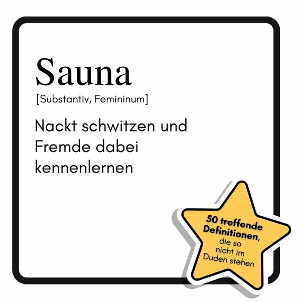 Schwitzende Fremde, fliegende Handtücher und skurrile Rituale: "Sauna: Nackt schwitzen und Fremde dabei kennenlernen" enthüllt die witzigsten Seiten des Saunierens. Wer wissen will, warum der Aufgusskübel mehr Drama birgt als jede Soap und wie ein Saunahut zum Gesprächsthema wird, findet hier die Antworten - und lacht sich dabei schlank.Für wen dieses Buch perfekt ist:- Für Saunafans mit Humor und Selbstironie- Für alle, die Wellness nicht zu ernst nehmen- Für Geschenkjäger auf der Suche nach dem UngewöhnlichenMit 50 pointierten Definitionen und liebevoll gezeichneten Illustrationen werden Klassiker wie Dampfbad, Birkenzweig oder Quellwasser neu interpretiert. Auch Saunatypen wie der Aufgussakrobat oder der Handtuchreservierer bekommen ihr Fett weg. Ein Buch, das Saunakultur mit Augenzwinkern feiert und garantiert für Gesprächsstoff im Ruheraum sorgt.Was dieses Buch bietet:- 50 humorvolle Definitionen rund um die Sauna- Passende Illustrationen zu jedem Begriff- Witzige Einblicke in Saunatypen und -rituale- Das ideale Geschenk für Saunagänger und Neugierige