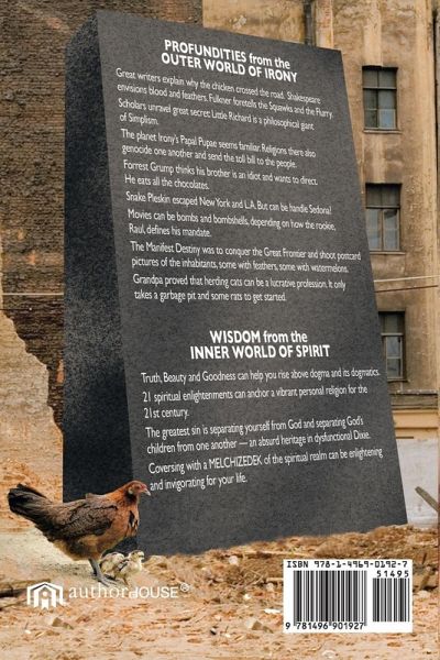 Readers can join the Absurd Sojourns and Spirit-mind quests of the author over a couple of decades in which in two centuries collide. Eternal satirical questions are considered in part one: Can literary giants such as Shakespeare, Hemingway and Faulkner explain why the chicken crossed the road? Is Little Richard the epitome of philosophic simplism? Can dark sibling Forrest Grump find reconciliation and also direct? Can Snake Pleskin escape both Sedona and Iraq? Does the white man's manifest destiny include photo ops with pliant Indians and black kids with watermelons? Can a novice movie reviewer separate bombs and bombshells? Will Christians, Jews and Muslims continue to kill each other with expensive explosives and send us the bill? How can the herdings of cats lead to wealth and fame? And in part two ... humans have a spiritual endowment and personal mission they can't begin to imagine. Is your own personal Truth-Beauty-Goodness your very best religion? Will you consider 21 new spiritual enlightenments for the 21st century? How have slavery, segregation and other acrimonious separations contributed to a malaise of spiritual poverty in the deep South? Are you persuaded by the spiritual realities expressed by a celestial Melchizedek? Did you know that the practice of Stillness can lead to fortuitous contact with spiritual teachers representing our Universal Father? Both parts lift the reader into a philosophical framework that combines perceptive topical humor and a sound path to weave personal spiritual growth into a crazy world.