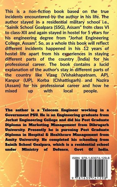 This is a non-fiction book based on the true incidents encountered by the author in his life. The author stayed in a residential military school i.e., "Sainik School Goalpara(SSG), Assam" from class VI to class-XII and again stayed in hostel for 5 years for his engineering degree from "Jorhat Engineering College, Assam". So, as a whole this book will reflect different incidents happened in his 12 years of hostel life apart from his experiences in staying different parts of the country (India) for his professional career. The book contains a lucid explanation of the author's stay in different parts of the country like Vizag (Vishakhapatnam, AP), Kanpur (UP), Korba (Chhattisgarh) and Nazira (Assam) for his professional career and how he mixed up with local people.