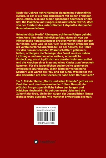 Nach vier Jahren kehrt Moritz in die geheime Felsenhöhle zurück, in der er als Kind gemeinsam mit seinen Freunden Anne, Jakob, Julia und Simon spannende Abenteuer erlebt hat. Die Mädchen und Jungen sind inzwischen fast 15, doch von der Existenz des unterirdischen Labyrinths ahnt außer ihnen niemand etwas.Beinahe hätte Moritz' Alleingang schlimme Folgen gehabt, wäre Anne ihm nicht heimlich gefolgt, denn ein von der Höhlendecke herabstürzender Brocken verfehlt den Jungen nur knapp. Aber was ist das? Der Felsbrocken entpuppt sich als versteinerter Saurierschädel! In der Absicht, die Höhle vor den nun anrückenden Wissenschaftlern geheim zu halten, schleppen die Teenager das Fossil zu einer nahen Lichtung - und machen eine weitere, schauerliche Entdeckung, als sich plötzlich ein dunkler Hohlraum auftut und die Knochen einer Frau und eines Kindes zum Vorschein kommen. Für die Jugendlichen beginnt eine spannende, emotionale Spurensuche. Wann lebte der versteinerte Saurier? Wer waren dieFrau und das Kind? Was hat es mit den Gerüchten um den Hexenturm nahe beim Dorf auf sich?Im 3. und letzten Teil der Reihe "Moritz und seine Freunde" geht es um Evolution und den Hexenwahn der frühen Neuzeit, der plötzlich ins ganz persönliche Leben der Jungen und Mädchen hineinwirkt. Es geht um erste Liebe und die Zukunft der Erde, die in den Augen der Jugendlichen längst nicht so trübe aussieht, wie mancher Erwachsene sie malt.