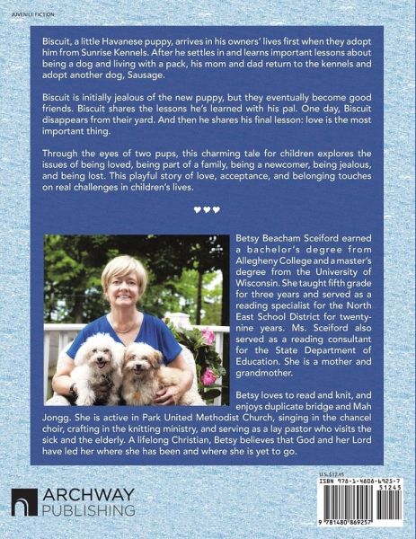 Biscuit, a little Havanese puppy, arrives in his owners' lives first when they adopt him from Sunrise Kennels. After he settles in and learns important lessons about being a dog and living with a pack, his mom and dad return to the kennels and adopt another dog, Sausage. Biscuit is initially jealous of the new puppy, but they eventually become good friends. Biscuit shares the lessons he's learned with his pal. One day, Biscuit disappears from their yard. And then he shares his final lesson: love is the most important thing. Through the eyes of two pups, this charming tale for children explores the issues of being loved, being part of a family, being a newcomer, being jealous, and being lost. This playful story of love, acceptance, and belonging touches on real challenges in children's lives.