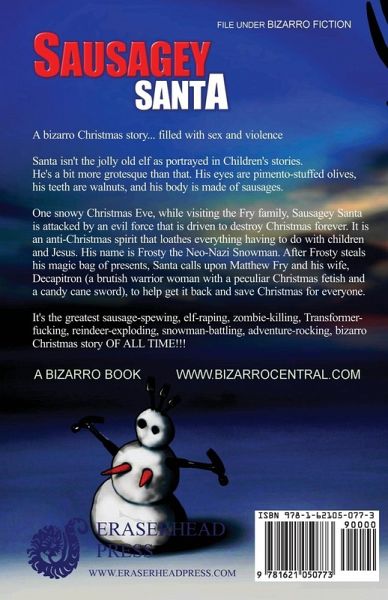 Santa isn't the jolly old elf as portrayed in Children's stories. He's a bit more grotesque than that. His eyes are pimento-stuffed olives, his teeth are walnuts, and his body is made of sausages. One snowy Christmas Eve, while visiting the Fry family, Sausagey Santa is attacked by an evil force that is driven to destroy Christmas forever. It is an anti-Christmas spirit that loathes everything having to do with children and Jesus. His name is Frosty the Neo-Nazi Snowman. After Frosty steals his magic bag of presents, Santa calls upon Matthew Fry and his wife, Decapitron (a brutish warrior woman with a peculiar Christmas fetish and a candy cane sword), to help get it back and save Christmas for everyone. It's the greatest sausage-spewing, elf-raping, zombie-killing, Transformer- fucking, reindeer-exploding, snowman-battling, adventure-rocking, bizarro Christmas story OF ALL TIME!!!