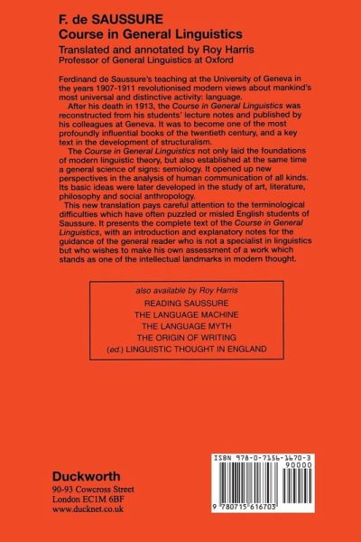 The Cours de linguistique generale, reconstructed from students' notes after Saussure's death in 1913, founded modern linguistic theory by breaking the study of language free from a merely historical and comparativist approach. Saussure's new method, now known as Structuralism, has since been applied to such diverse areas as art, architecture, folklore, literary criticism, and philosophy.
